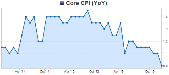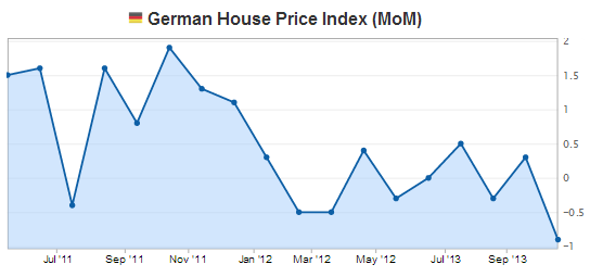 Perhaps the most alarming indicator that may give Mario Draghi nightmares is the German housing index. German economic conditions remain quite stable as the nation continues to show strong export growth (see discussion). Nevertheless the German housing market is exhibiting signs of a correction (chart below). Bundesbank has been warning that the nation's housing market may be overvalued – so a correction may indeed be in order. But based on the experiences in Japan and the US, a sharp housing correction from bubble levels could quickly ignite deflationary pressures.