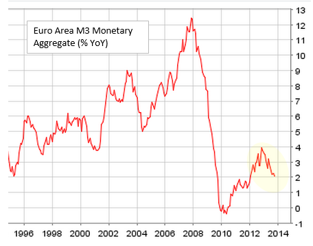 Similarly, growth in broad monetary aggregates (M3 money stock) has turned lower. This has been driven by tight credit conditions (some of which is due to poor demand), with loan growth remaining extraordinarily weak (see discussion).