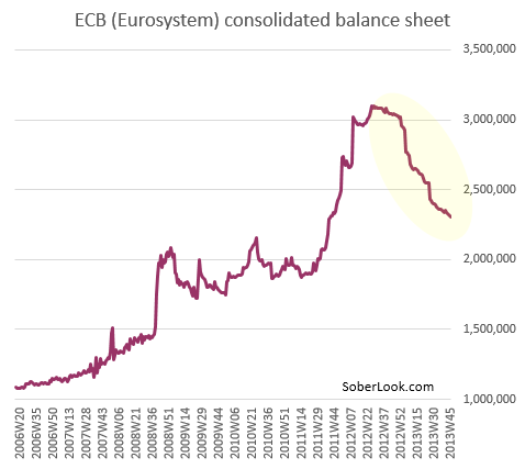 Some are attributing these risks to the fact that the ECB (Eurosystem) balance sheet has seen a massive decline this year. While this is a positive development since it was caused by the area's banks repaying MRO and LTRO obligations, some view the reduction in the size of the central bank balance sheet as a form of monetary policy tightening.