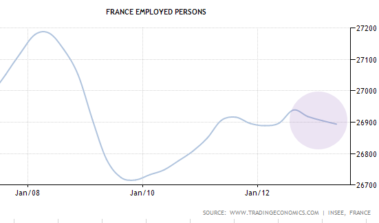 The area's already uneven economic recovery has stalled in a number of countries. We've seen the French GDP growth dip into the red again (see Twitter chart). The employment situation in France also remains shaky.