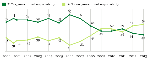 In 2006, the overall share was 69% to 28% in favor of the view that healthcare was the responsibility! Now it is 56% to 46% against.