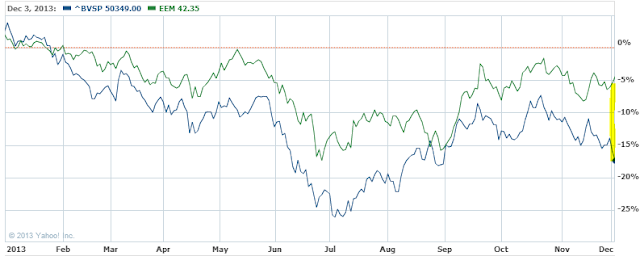 | Blue: Brazil BOVESPA, Green: iShares EM Index ETF |
