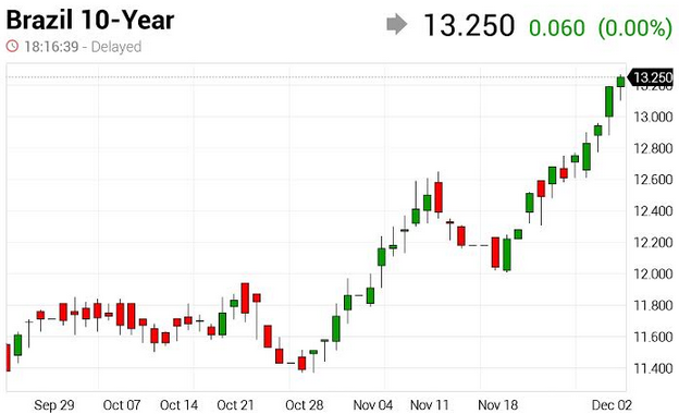 What's particularly troubling is the sharp increase in long-term interest rates, as investors dump domestic government bonds. The 10-year rate broke 13.25% today.