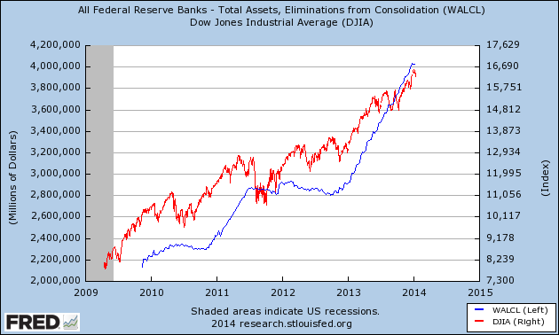 The barometer to use is this: If the Fed stopped cold turkey tomorrow all asset purchases, the Dow would drop 3,500-4,000 points in less than a year (maybe even as little as 6 months), and this is a conservative 25% drop in value just in the short term.
