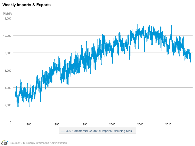 In reviewing the EIA weekly petroleum report, the oil imports figure came in at 6.889 (Million Barrels per Day) for the week ending 01/10/14. This number compared to a year ago 8.030 (Million Barrels per Day) puts a nice cap on the downtrend which really started gaining steam in 2010 onward.
