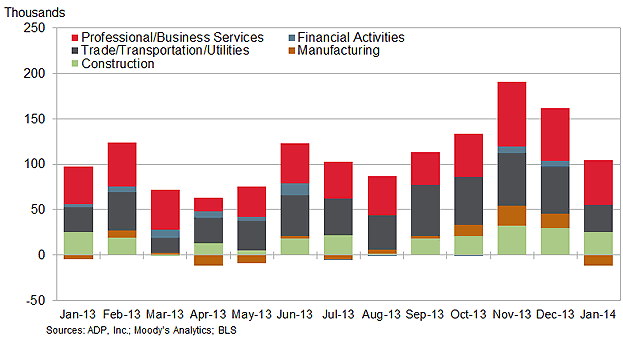 There wasn't anything particularly special about today's ADP private payrolls number. The company estimates that about 175,000 private sector jobs were added in January. The slowdown in manufacturing (see post) resulted in some job losses in that sector – which remains volatile. The one area that continues to show resilience however is construction.