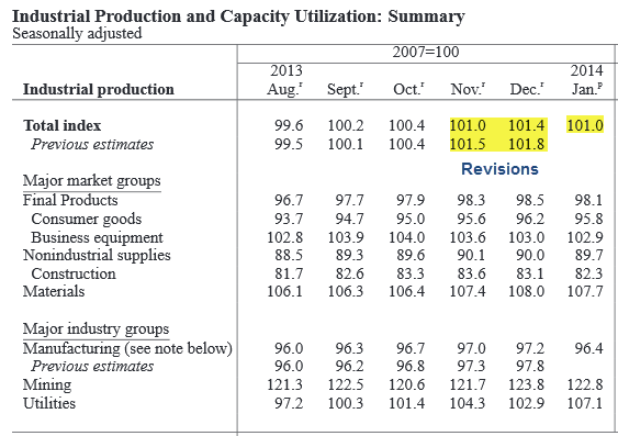 This morning the Fed reported Industrial production declined. Moreover November and December were revised sharply lower.