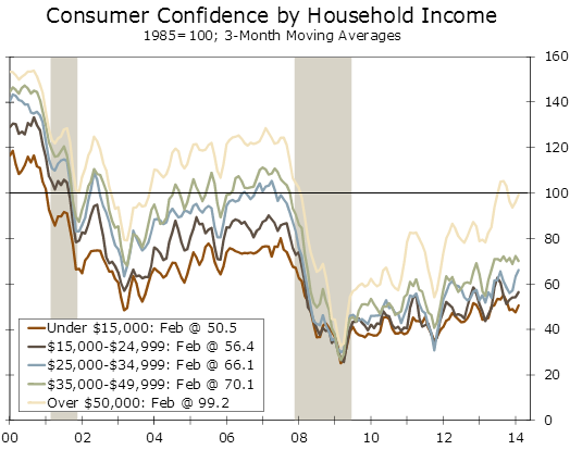 Given that confidence is often linked to income growth (including expectations of future income), this could be a further indication of wage stagnation for employees in the lower wage brackets (see discussion). In the long run this growing income inequality may end up creating headwinds for economic expansion in the US.