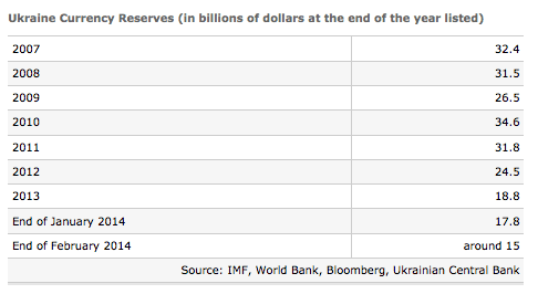 On Wednesday, Stepan Kubiv [governor of Ukraine’s national bank since Monday], noted that his country’s foreign currency reserves had dropped from $17.8 billion (€13 billion) to $15 billion just since the beginning of February, as the national bank attempted to prop up the exchange rate of the country’s currency, the hryvnia. Those efforts met with little success, and the hryvnia has fallen to a record low against the dollar.