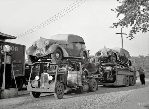 Carl Mydans Auto transport at Indiana gas station. May 1936