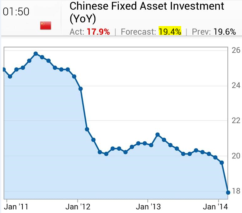 BW: – “The fairly dramatic slowdown is unusual in Chinese economic history of the last decade” and the figures were “shockingly weak,” said Dariusz Kowalczyk, senior economist and strategist at Credit Agricole CIB in Hong Kong. “It points to a major deceleration of momentum in the beginning of 2014,” wrote Kowalczyk in a research note.