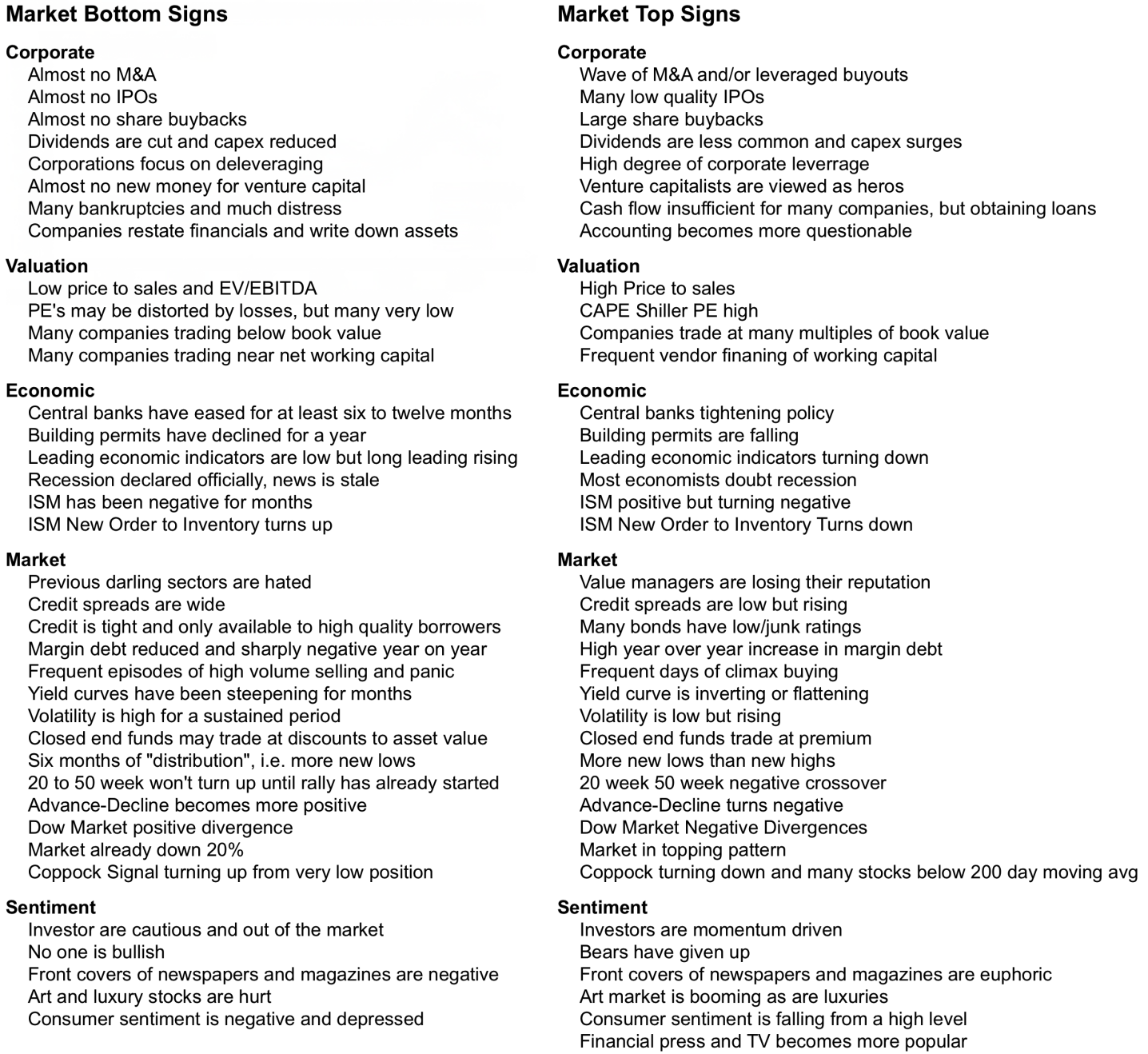 In the following table, we summarize the signs of market bottoms and tops.