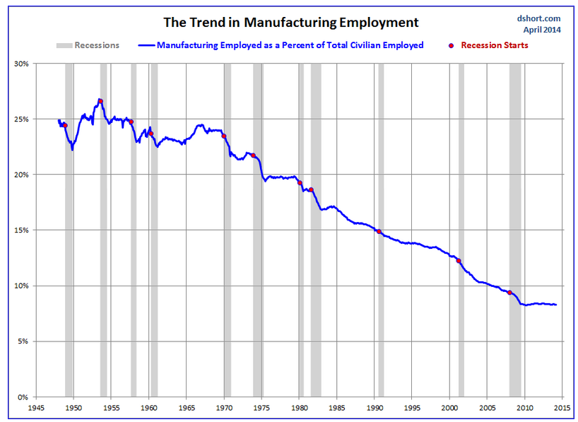 I’ll close this footnote with a look at the Manufacturing Workforce as a percent of the Civilian Employed.