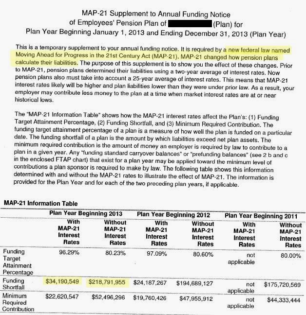 Of course in the current low interest rate environment the present value of liabilities for many pension plans is much greater than the value of the assets, making these plans insolvent. That would mean companies need to inject cash into these pension plans each year to keep them afloat. But here comes MAP-21 to the rescue. Let's allow pensions to use interest rates averaged over the past 25 years to discount the liabilities. That makes the discount rates much higher and the discounted liabilities much lower. It's not mark to market but rather mark to the past 25 years. All of a sudden companies don't have to pony up large amounts to keep these pensions afloat. Magic.