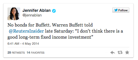 Obviously Buffett, like many others, expects interest rates to rise significantly over the long-term. This means any fixed income investment is going to get smoked, as the amount you get paid for holding them is worth less and less and as inflation erodes the value of the principal.
