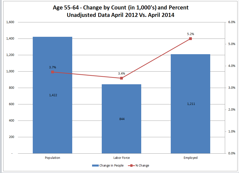 Population in age group 55-64 is up by 1,422,000 and employment is up by 1,211,000. Percentage-wise population is up by 3.7%, while employment is up 5.2%. This is a huge difference compared to stats for the core age group 25-54. We would need a finer breakdown to see if retirement is pushed back in the 62-64 age group but other evidence, notably the 65+ age group strongly suggests just that.