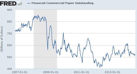 Investors looking to park cash outside of bank deposits can also buy bank commercial paper (CP), which is what most "prime" money markets have been doing. But banks do not like to rely on commercial paper for funding because many found themselves unable to roll it during the financial crisis. The volumes of bank CP therefore remain subdued (with rates declining as well).