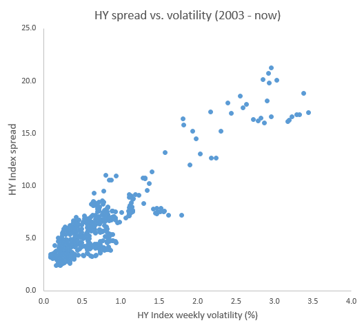 What happens in an environment – such as the one we are in currently – that is characterized by prolonged periods of low volatility? One of the effects of diminished price swings is the decline in return expectations. As an example, the chart below shows the spread demanded by investors in US high yield bonds vs. the volatility of total returns in that market.