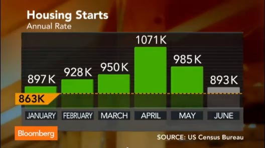 Beginning home construction unexpectedly declined in June to a nine-month low as a record plunge in the South swamped gains in the rest of the U.S. Housing starts fell 9.3% to an 893,000 annualized rate, from a 985,000 pace in May that was weaker than initially estimated, figures from the Commerce Department showed today. Construction slumped 29.6% in the South to a 375,000 pace, the weakest in almost two years. The figures, along with a decline in building permits, corroborate Federal Reserve Chair Janet Yellen’s view that progress in the housing market has been “disappointing” this year.