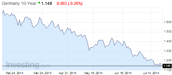 1. Long term rates across the Eurozone are already at incredibly low levels. The ECB's forward guidance, weak growth, and recent geopolitical risks have pushed German rates to new lows (see chart). On the other hand the OMT program, often called the "Draghi put", has suppressed periphery yields. Furthermore, with short-term rates near zero and low capital requirements to hold sovereign bonds, the euro area banks have been loading up on this paper in a massive carry trade – pushing yields even lower.