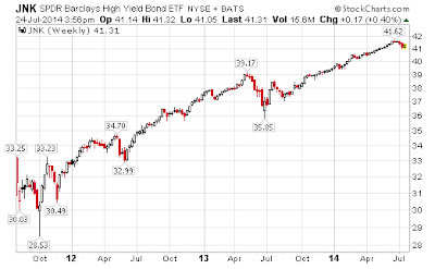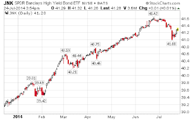 Things may have changed in July as the following chart shows, using JNK (the Barclays High Yield ETF) as a proxy for junk bonds.