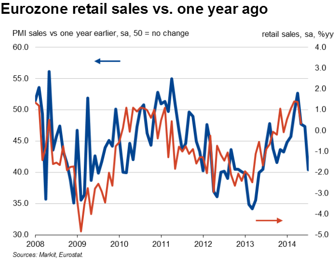 Markit: – The eurozone retail sector started the second half of the year on a weaker footing. The fragility of consumer spending was exposed by the PMI, particularly in France and Italy where the data showed sharper downturns in sales. Even in Germany, the one area of relative strength, there was an appreciable slowdown from June’s recent peak. Retailers underperformed relative to their targets to the greatest extent since March 2013, leading to further accumulations of unsold stock and the prospect of greater discounting ahead.