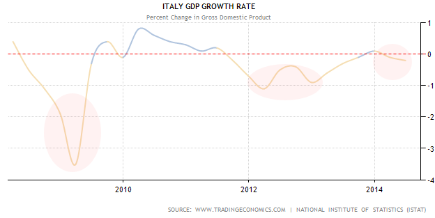 Italy's economy contracted at an annualized rate of 0.8% in the quarter ending June 30, according to a first estimate by national statistics institute Istat—the latest sign of how parts of Europe are still struggling to escape the legacy of the global financial crisis. It was the second successive quarter of falling Italian output, which meets the common international definition of a recession.