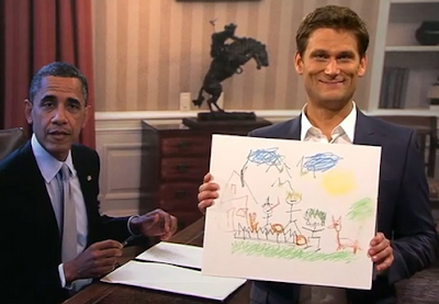 “Mr. President!” he said, impersonating a White House staffer rushing to bring evidence to President Obama – “I’m pleased to inform you that we finally have evidence! …I apologize, this is a picture my daughter drew… oh, here it is: I drew this one myself!” Ehring proclaimed.