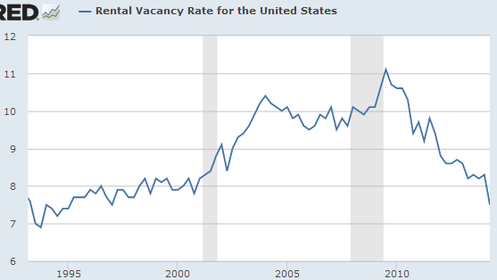 However, this is only part of the story. The number of housing starts for single-family units remains to a large extent range-bound (see chart). A great deal of the new housing growth instead is coming from multi-family construction (see chart). And that's driven by the rapidly rising demand for rental housing in the US, as shortages become more pronounced (see post). Rental vacancies are now at the lowest level in 17 years and falling.