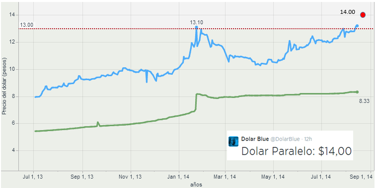 The "parallel" exchange rate also hit a record, with the dollar quoted at 14 pesos – a 67% premium to the official rate. Note that before the first devaluation in 2002 (see this NY Times story) it was one peso to the dollar.