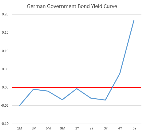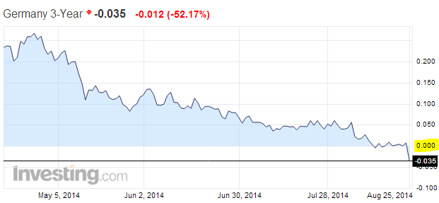 Investors also piled into the three-year government notes, sending those yields into negative territory for the first time since 2012. The German government is now getting paid to hold your euros for three years.