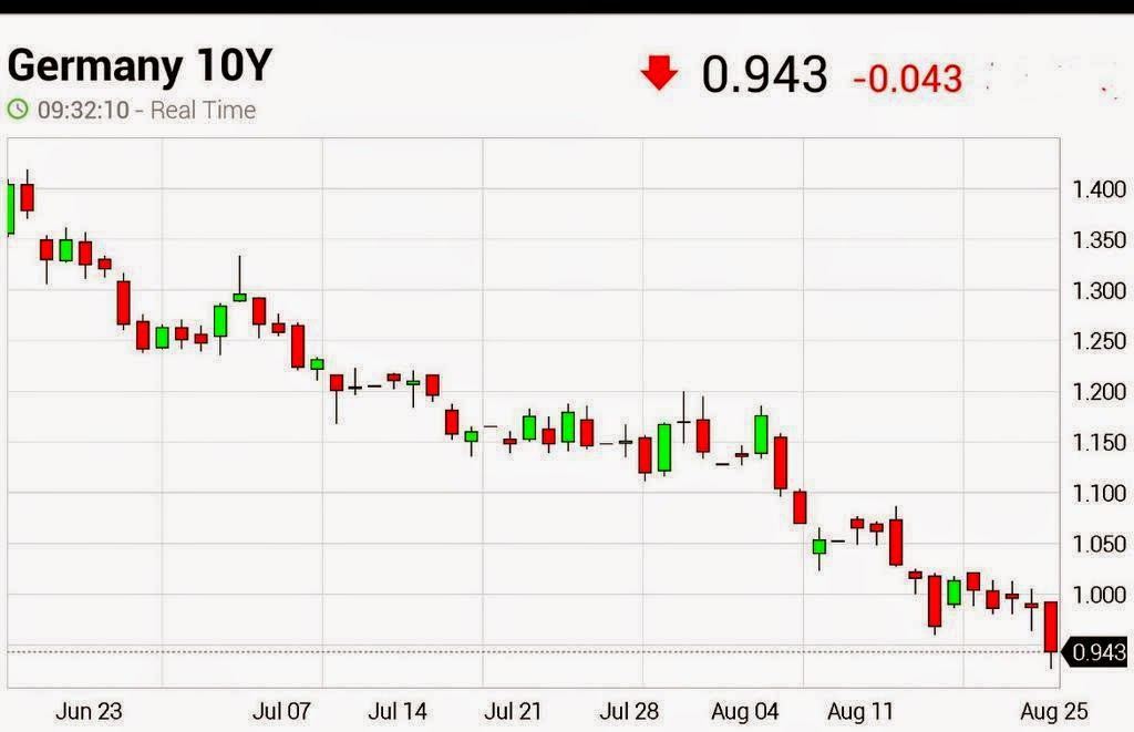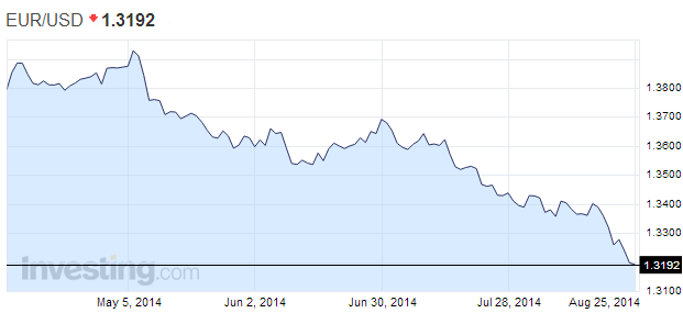 The euro dropped below 1.32, with rising expectations of diverging monetary policies between the US and the Eurozone. This was fueled in part by the Jackson Hole conference where Janet Yellen's speech was not as dovish as some had expected. The currency weakness will deliver some much needed relief for the euro area by helping the exporters and by providing some support to import prices. Currency weakness is one way to arrest deflationary pressures – the Japanese way.