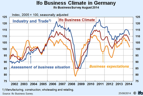 The Guardian: – German business sentiment dropped for a fourth straight month in August as concerns about the Ukraine crisis and the effect of sanctions against Russia swept through corporate boardrooms in Europe's largest economy.