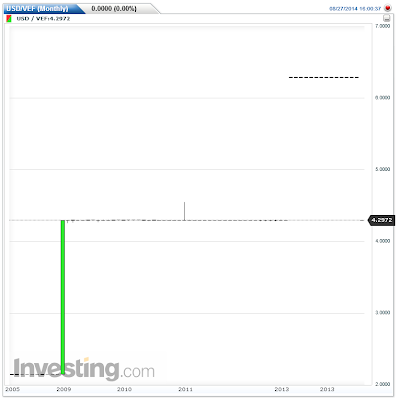 On the black market today, it takes 89 bolivars to buy 1 US dollar. That is a 95% loss in value vs. the official exchange rate since 2013.