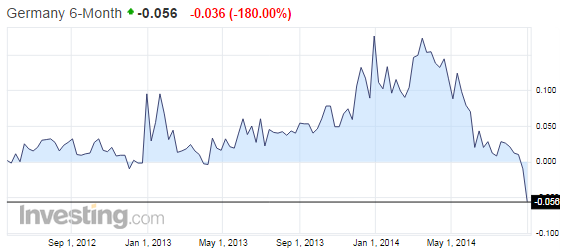 So what are banks doing with their cash? The easiest option is to buy sovereign debt, particularly short term notes. Government paper has minimal to no impact on regulatory capital needs and does not cost banks the 20bp charged by the ECB. That's why banks (and others) are willing to (in effect) pay the German government to hold some of their excess liquidity. Below is the chart of German 6-month bill yield.