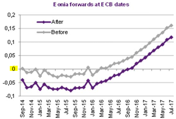 Moreover, the forward markets are now pricing EONIA rates to stay firmly planted in the negative territory through at least the mid-2016. The chart below shows the forward curve before and after the ECB action.