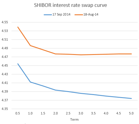 This is probably the least effective QE-style action, as state-owned lenders are unlikely to efficiently deliver capital into the private sector. But the fact that the PBoC has taken this action tells us this could be the start of a longer monetary stimulus effort. The markets are not expecting a near-term economic improvement and instead pricing in a prolonged battle to accelerate growth. China's SHIBOR rate swap curve has become more inverted than a month ago with expectations of further rate declines.
