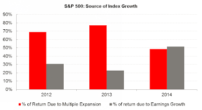 In 2012 nearly 70% of share price increases were due to willingness of investors to accept higher PEs. In 2013, nearly 80% of the stock market rally is attributable to higher PEs.