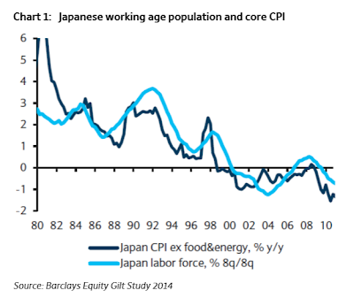 Japan-style deflation across the Eurozone is no longer an outrageous thought. As you can see from chart 1, there is a close link between CPI and demographics. That has certainly been the case in Japan and I don’t see any reasons why it should be any different in Europe. The negative demographic trends are perhaps not as acute in Europe as they were in Japan in the early to mid 1990s, so one might expect a less dramatic outcome here, but the writing is on the wall. Furthermore, Japan’s problems were multiplied due to an almost complete lack of political recognition and willingness to take drastic action. At least, with Mario Draghi in charge of the ECB, there seems to be a willingness to do something.
