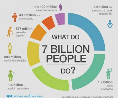 Reader Bran who lives in Spain sent some interesting charts of population, expected population growth, the world’s largest cites, and what people do for a living. I don’t have links for the charts, but most show the origin.