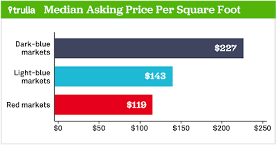 Nine of the 10 bluest markets had median home asking prices above $130 per square foot. All of the 10 reddest markets had prices below that. In the dark blue markets, housing cost almost twice as much ($227 per square foot) as in the red ones ($119). In metro Washington — this is not just the District — the average home asking price was about $177.