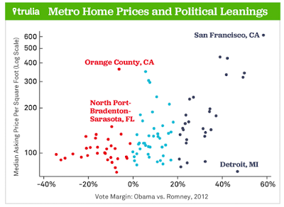 Median asking price in dollars per square foot is on the vertical axis. Margin for Obama over Romney in the 2012 election is on the horizontal axis.