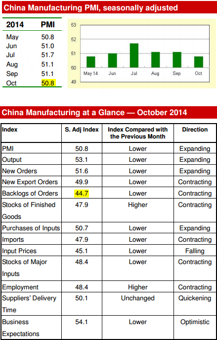 China's official manufacturing PMI report just came out – and it’s weaker than projected. The print was 50.8 vs. 51.2 expected. Orders backlog looks especially weak.