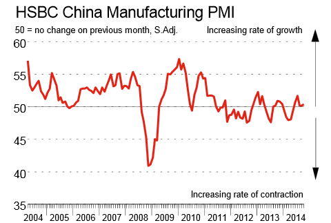 The HSBC China Manufacturing PMI shows weaker expansions of output and new orders.