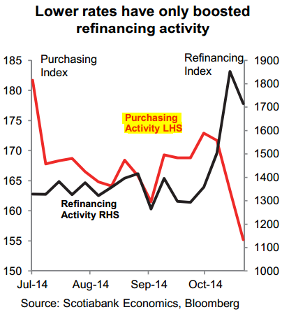 At the same time the demand for mortgage loans has weakened, with the recent rate drop only impacting refi activity. Part of the reason is the rise in property prices over the past couple of years which also prices many first-time buyers out of the market.
