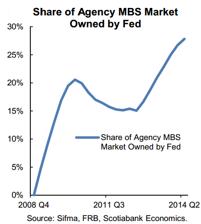 To exacerbate the situation, over a quarter of outstanding MBS bonds has been permanently locked up on the balance sheet of the Federal Reserve. This takes a significant chunk of an already shrinking market out of private hands. And in spite of the securities purchases ending, the Fed will continue to buy MBS to compensate for prepayment amortization.