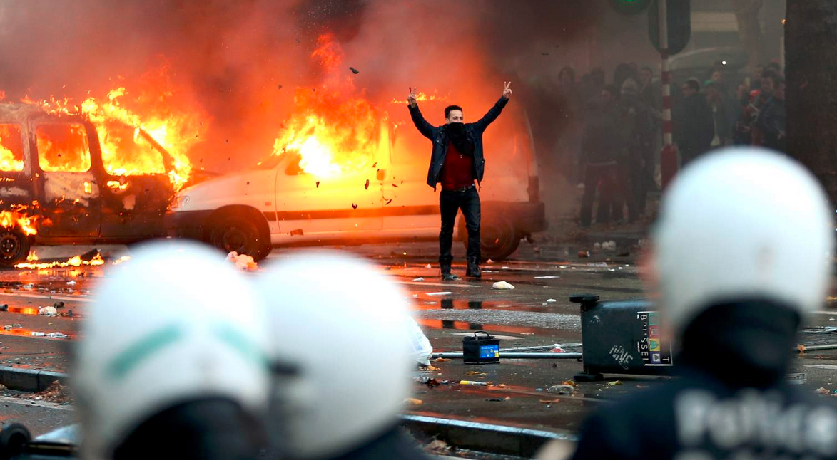 Riot police have fired tear gas and water cannon during clashes with demonstrators as at least 100,000 people marched through Brussels in the first mass protests against government austerity measures.