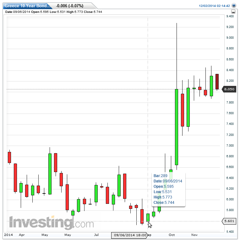 Since the beginning of September, yield on the Greek 10-Year bond has gone from 5.53% to 8.05% with a spike high of 9.28%.