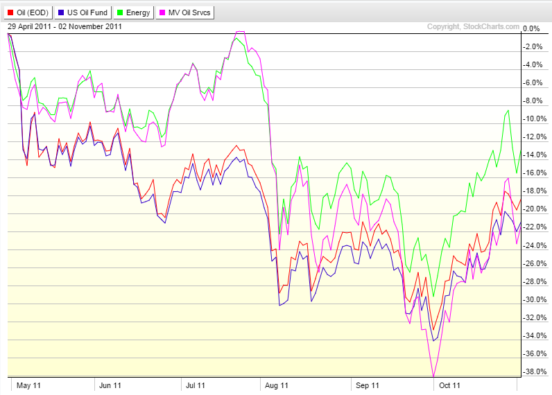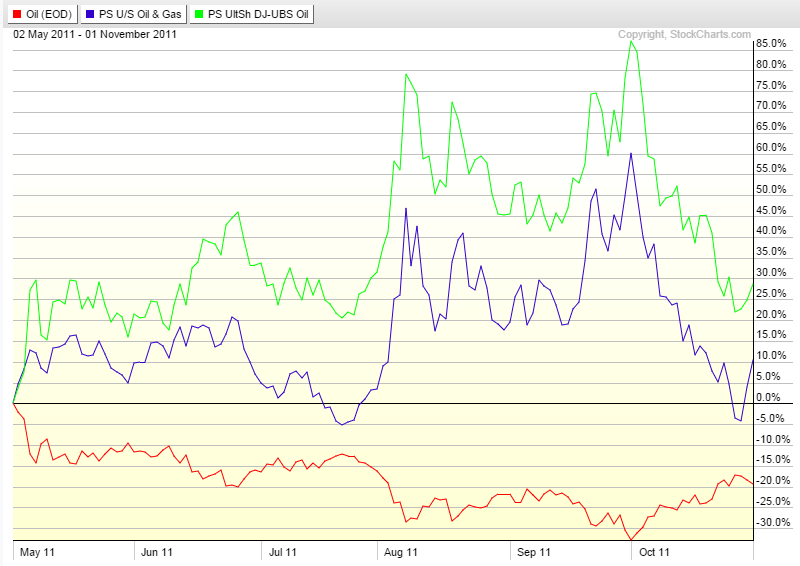 During that period, oil was down as much as 32% and finished the period down about 18%. Interestingly enough, the non-future based ETF XLE and OIH lagged the downside move but abruptly caught up in August 2011. But this also a month where the overall market suffer a large loss so looking at oil only doesn’t convey the complete picture. In essence, XLE and OIH are proxies for equity market with a strong influence from oil it seems. On the other hand, for that short term period, USO makes a pretty faithful proxy, down only a couple more percent that oil itself.