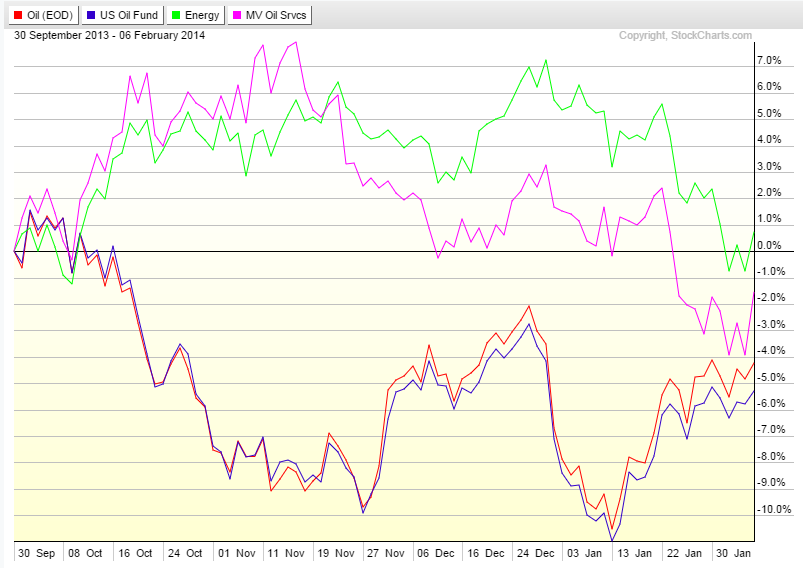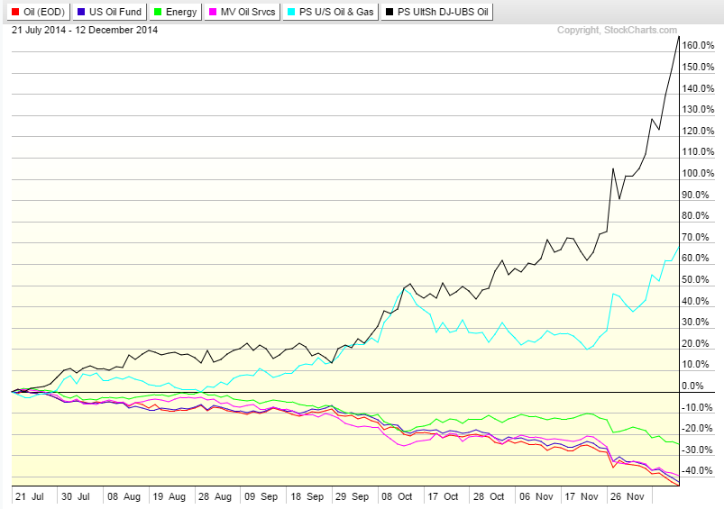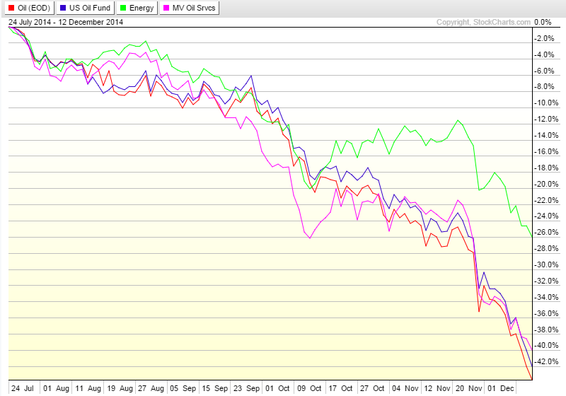 The current period shows a large down move by oil, down over 42% in 5 months. Clearly not a standard correction! This time, OIH follows the price of oil almost step for step. USO is again a decent proxy although showing more resilience at time. XLE is clearly supported by a strong equity market.
